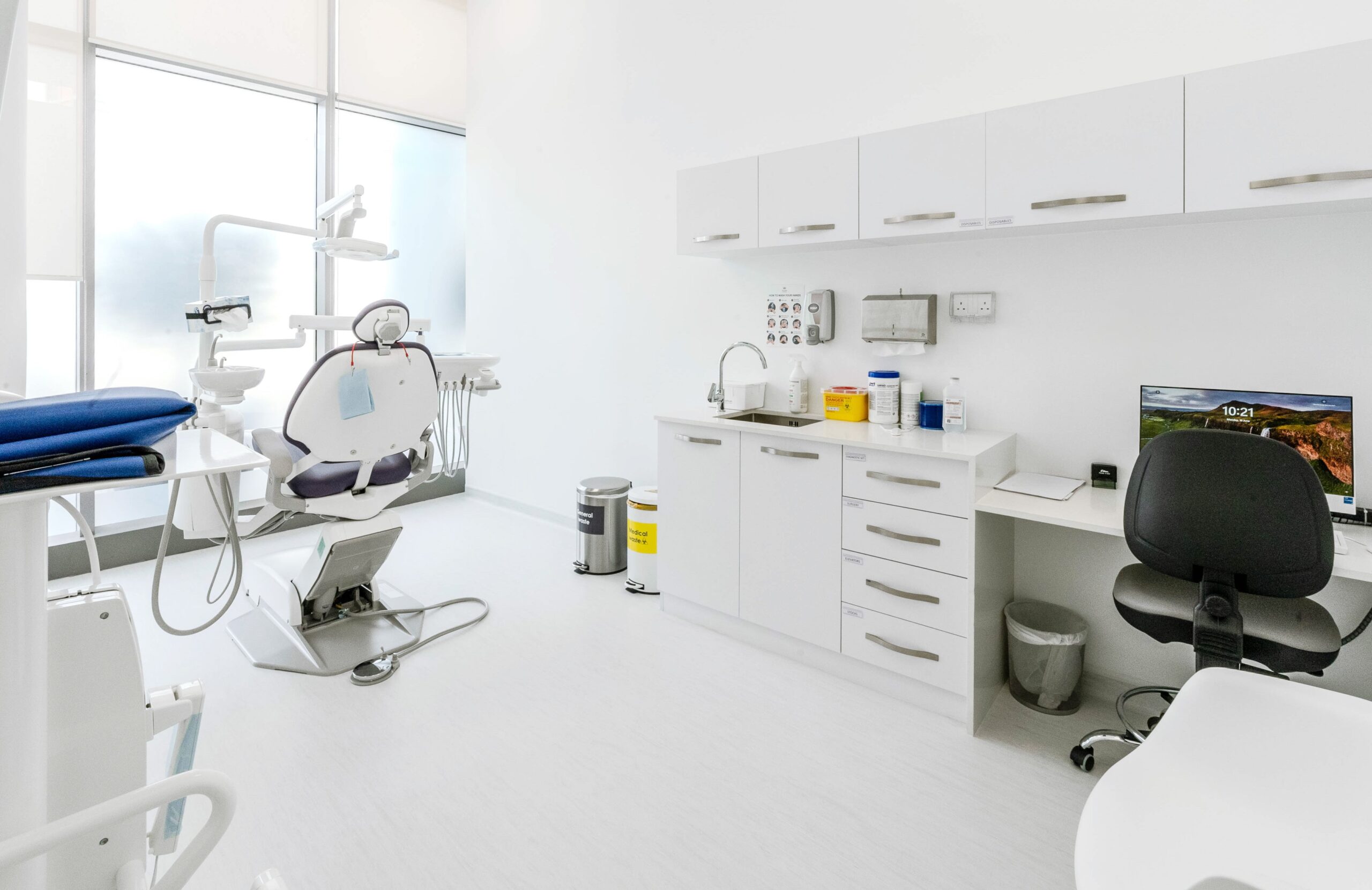 The clinic features a spacious, airy lobby with neutral tones and tasteful color accents, enhancing patient comfort. High-quality materials like marble flooring and wooden accents ensure durability and a premium feel. State-of-the-art technology is seamlessly integrated, supporting efficient workflows.